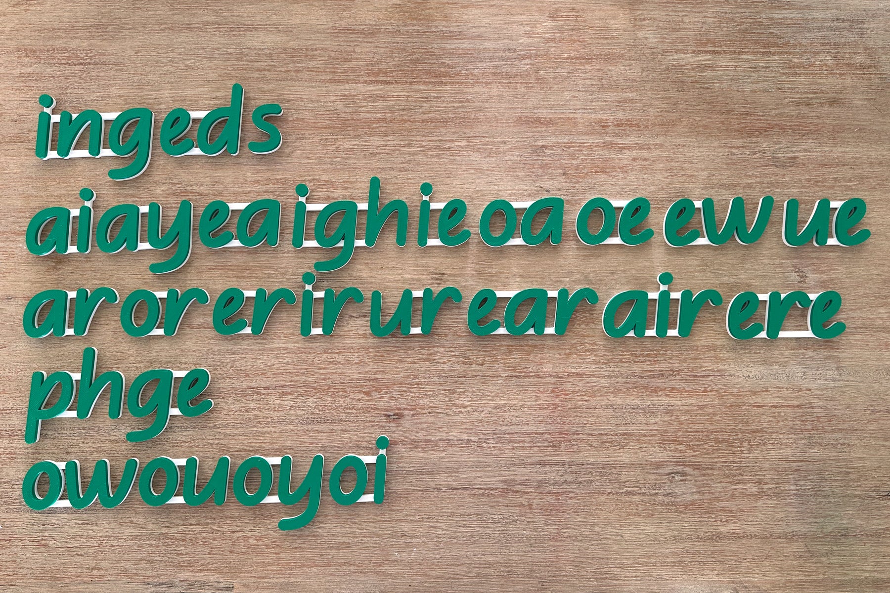 Biodegradable 3D printed plastic, easy to handle, letters 40-60mm high, 8mm thick and match the standard New Zealand handwriting script used in junior classrooms.